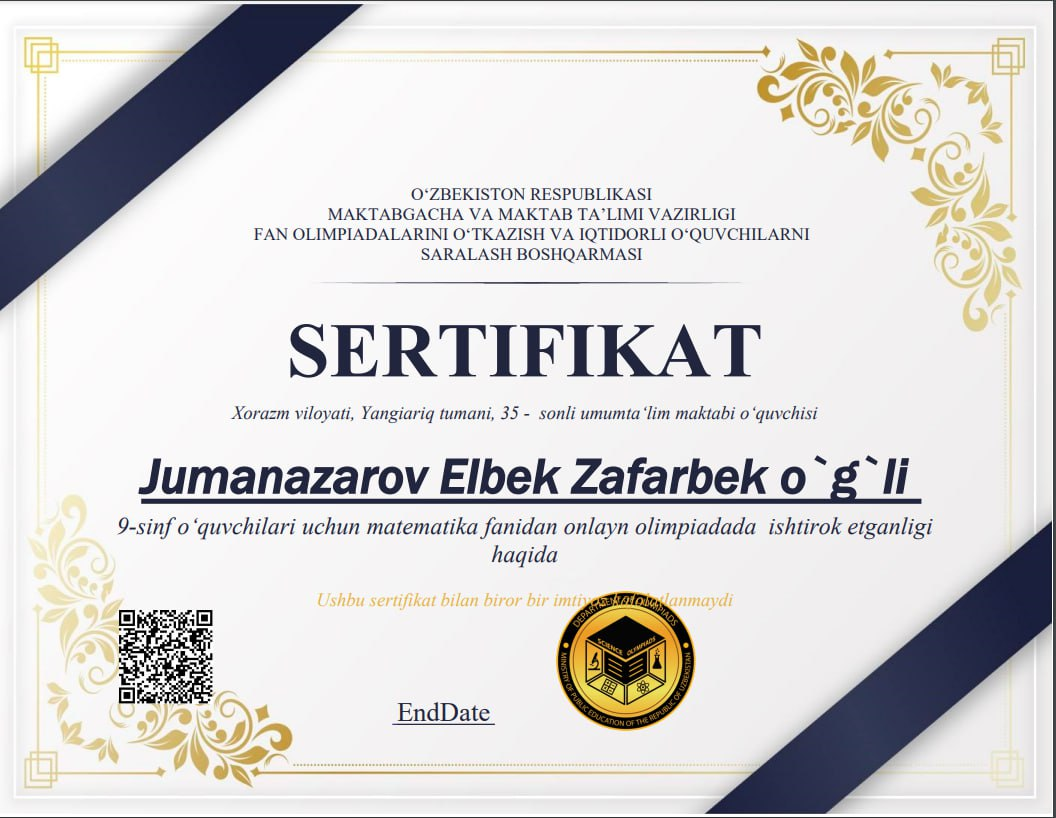 Yangiariq tuman 35-son maktab o'quvchilarimiz onlayin olimpiyada olgan sertifikarlari