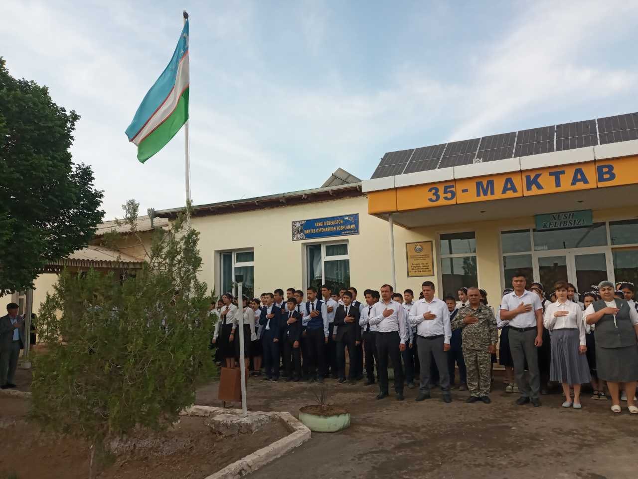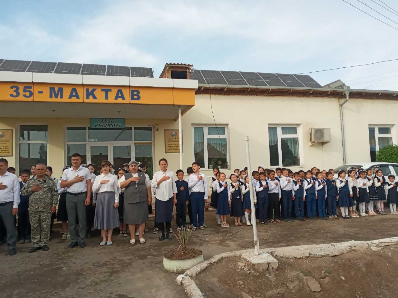 Dars ishlanmalar 24-04-2024, 11:05 Xorazm viloyati Yangiariq tumani 35-son maktabda birinchi soat darslar O'zbekiston Respublikasi Davlat Madhiyasini kuylash bilan boshlandi.