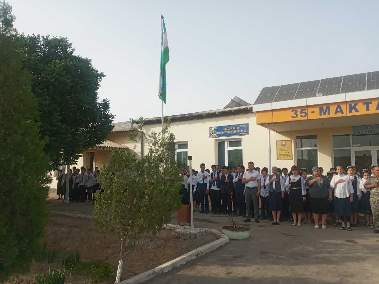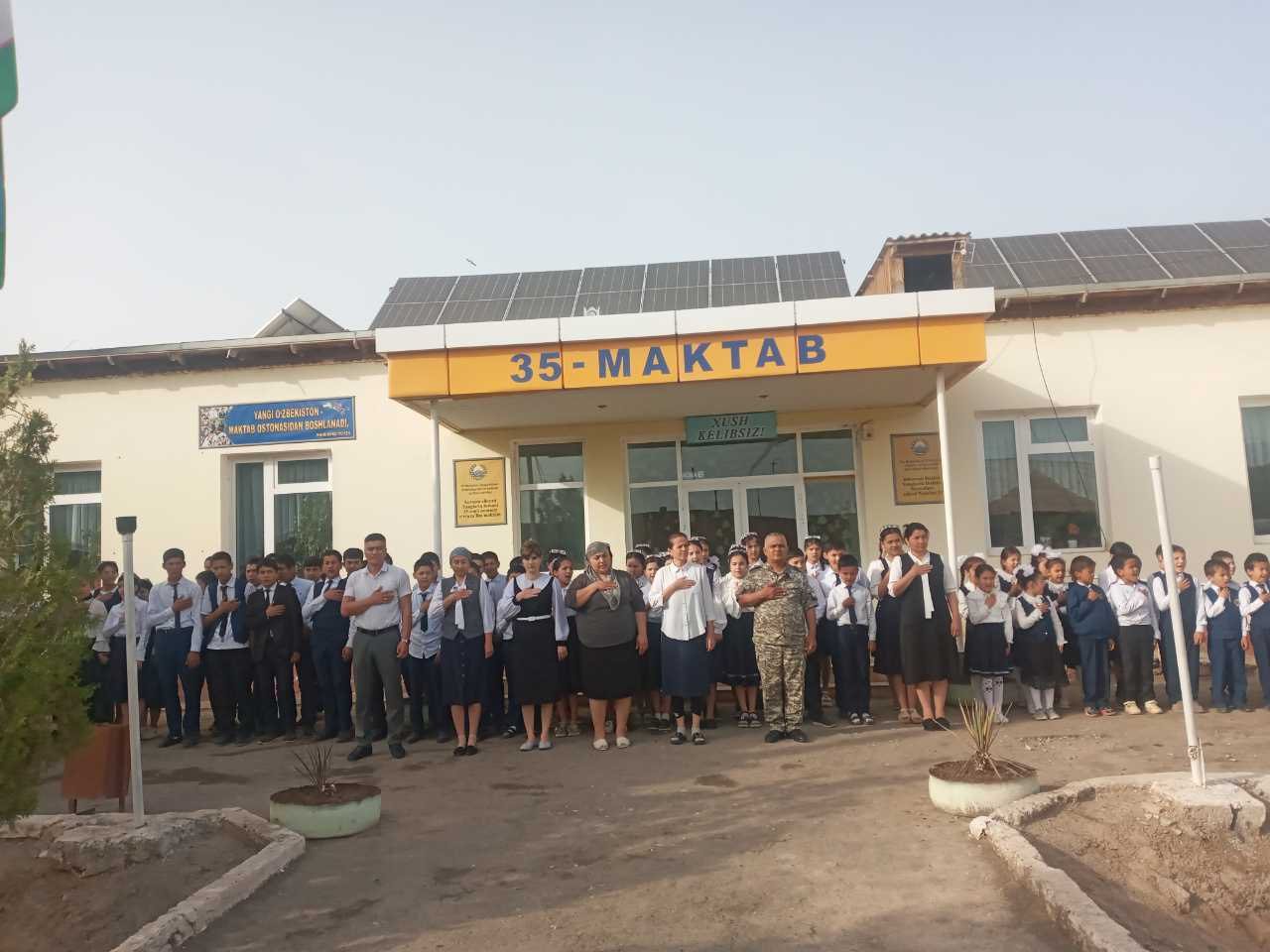 Dars ishlanmalar 3-05-2024, 08:53 Xorazm viloyati Yangiariq tumani 35-son maktabda birinchi soat darslar O'zbekiston Respublikasi Davlat Madhiyasini kuylash bilan boshlandi.
